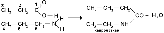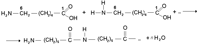 Упрощенно превращение капролактами в полимер, из которого производят капроновое волокно, можно представить следующим образом. Капролактам в присутствии воды превращается в 6-аминогексановую кислоту, молекулы которой реагируют друг с другом: