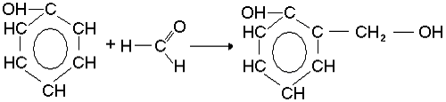 Строение молекул. Реакция поликонденсации – процесс образования высокомолекулярных соединений из низкомолекулярных, которые сопровождается выделением простых низкомолекулярных продуктов (H>2>O, NH>3>, HCl и др.) [3, 5]. Рассмотрим, как при реакции поликонденсации образуются фенолформальдегидные смолы. Известно, что в молекуле фенола в положениях 2, 4 и 6 атомы водорода весьма подвижны, а для альдегидов характерны реакции присоединения, обусловленные наличием в них -связи. В связи с этим реакцию фенола с формальдегидом можно отразить так: