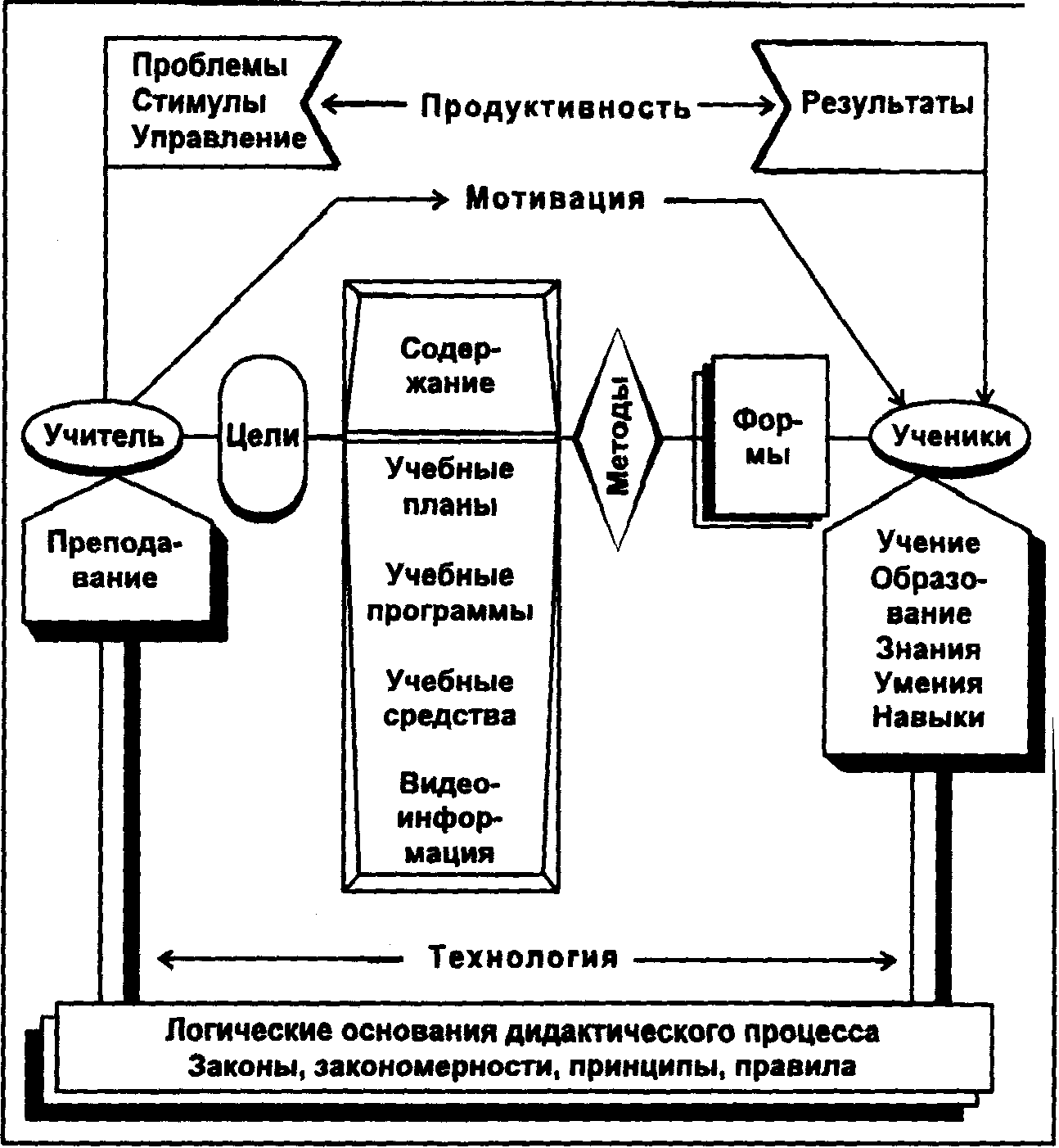 Обучение — упорядоченное взаимодействие педагога с учащимися, направленное на достижение поставленной цели. Учебный (дидактический) процесс содержит следующие главные звенья взаимодействия: