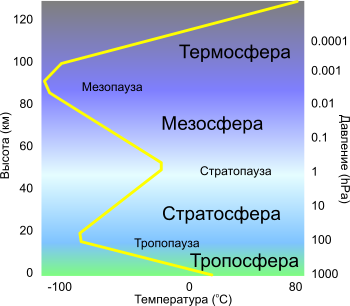 Следующий слой, лежащий над стратосферой, это мезосфера. Мезосфера начинается на высоте 50 км и простирается до 80—90 км. Температура воздуха до высоты 75—85 км понижается до −88 °С. Верхней границей мезосферы является мезопауза, где расположен температурный минимум, выше температура вновь начинает расти. Далее начинается новый слой, который называется термосферой. Температура в ней быстро растет, достигая 1000 – 2000 °С на высоте 400 км. Выше 400 км температура почти не меняется с высотой. Температура и плотность воздуха очень сильно зависят от времени суток и года, а также от солнечной активности. В годы максимума солнечной активности температура и плотность воздуха в термосфере значительно выше, чем в годы минимума.