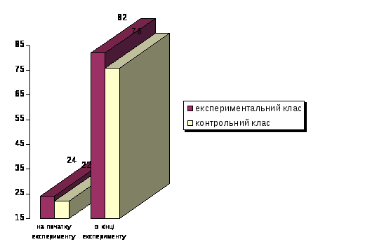 У контрольному класі (24 учні) високий рівень розвитку математичних уявлень і понять має 2 учні, середній – 14 і низький 8 школярів. Порівняно з початком експерименту, показники сформованості відповідних умінь зросли в обох класах (початковий рівень відповідно 22 і 24%). Проте в експериментальному класі показники виявилися значно вищими (відповідно 76 і 82% – див. діаграму).