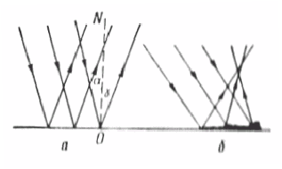 Металеві поверхні, лише шліфовані, але не поліровані, можуть мати окремі нерівності, розміри яких перевищують довжину хвилі. І тоді падаючий паралельний пучок після відбивання розсіюється (мал.4, б), хоч переважна частина енергії світла все-таки поширюється в напрямі дзеркального відбивання. Коли нерівності нагромаджені хаотично (матові поверхні), паралельний пучок повністю розсіюється і напрям поширення енергії не залежить від напряму падіння (дифузне відбивання світла). Цей вид відбивання світла має дуже важливе значення в житті людей і тварин, бо дає змогу бачити не лише світні тіла, а й несвітні, що опромінюються джерелами світла.