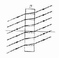 Розглянемо, як змінюється гомоцентричний пучок променів монохроматичного світла після заломлення на плоскій поверхні поділу двох прозорих середовищ. Оскільки на практиці, як правило, маємо справу з Плоско паралельними або клиноподібними пластинками прозорої речовини, яку з двох боків оточує повітря, досить розглянути цю конкретну задачу. Як і під час вивчення закону заломлення, треба починати з найпростішого: з розгляду заломлення паралельного пучка променів на плоско паралельній пластинці (мал.7). З умов симетрії випливає, що кожний промінь такого пучка виходить з пластинки паралельно попередньому напряму, трохи змістившись униз. Величина зміщення залежить від товщини пластинки, показника заломлення її матеріалу і від кута падіння. Із зростанням цих величин зміщення збільшується. В цілому пучок променів після заломлення на передній і задній площинах лишиться паралельним і з тим самим перерізом. Отже, плоскопаралельна пластинка не спотворює і не змінює паралельного пучка променів.