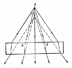 Потім доцільно розглянути проходження розбіжного гомоцентричного пучка променів через плоскопаралельну пластинку (мал.8). У цьому разі, хоч кожний промінь зміщується паралельно своєму попередньому напряму, промені падають на пластинку під різними кутами, отже, й величина зміщення різна для різних променів. Тому зворотні продовження цих променів не перетинатимуться в одній точні. Зворотні продовження променів, більш віддалених від осі, перетинаються ближче до пластинки. Навпаки, промені, менш нахилені до осі, перетинаються далі від пластинки. Отже, гомоцентричність широкого пучка променів світла після заломлення на плоскопаралельній пластинці трохи порушується. Звичайно, коли взяти вузький гомоцентричний пучок (ОАА'), то його гомоцентричність практично зберігається й після заломлення.