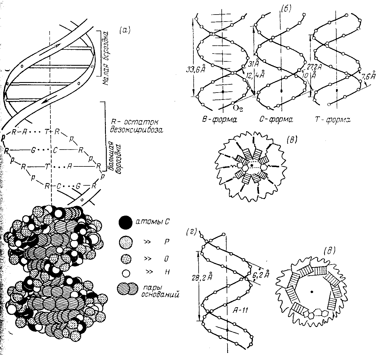 На основе правил Чаргаффа и данных рентгеноструктурного анализа, Дж. Уотсон и Ф. Крик предложили двухспиральную модель ДНК и развили важную для биохимии концепцию комплементарности. Они предложили три уровня структуры ДНК: первичную (последовательность нуклеотидов), вторичную (структура двух правозакрученных спиралей), третичную (дополнительное закручивание в пространстве двухспиральной молекулы). В образовании вторичной и третичной структур важную роль играют водородные связи, возникающие между парами оснований аденин — тимин и гуанин — цитозин, а также гидрофобные взаимодействия между основаниями, направленные вдоль цепей молекулы ДНК. Разрушение этих связей нагреванием или подщелачиванием растворов вызывает денатурацию ДНК.