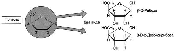 Нуклеотиды представляют собой нуклеозиды с присоединенной эфирной связью к остатку рибозы или дезоксирибозы фосфатной группой. В образовании связи участвует 5'-углеродный атом пентозы. В зависимости от строения пентозы все нуклеотиды можно разделить на рибонуклеотиды и дезоксирибонуклеотиды: