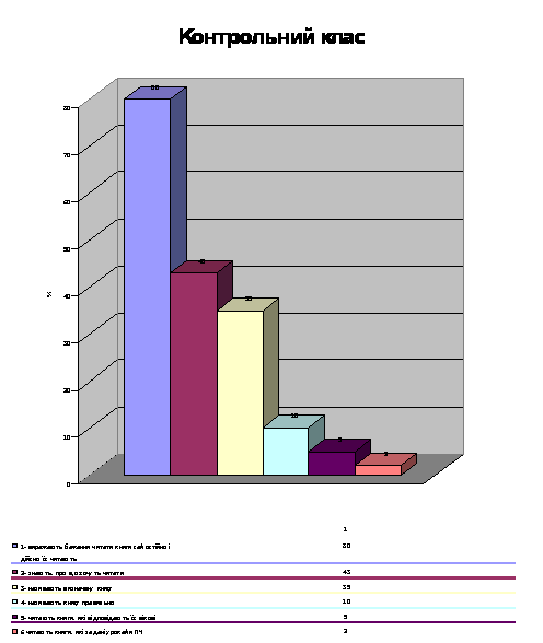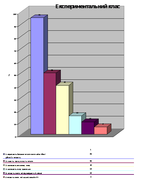 Як бачимо з таблиці, результати в учнів експериментального класу значно вищі, ніж в контрольному класі. Учні експериментального класу краще орієнтуються в колі доступних книг, добре засвоїли зв'язки книга-автор, книга-жанр, книга-тема, правильно називають книгу.