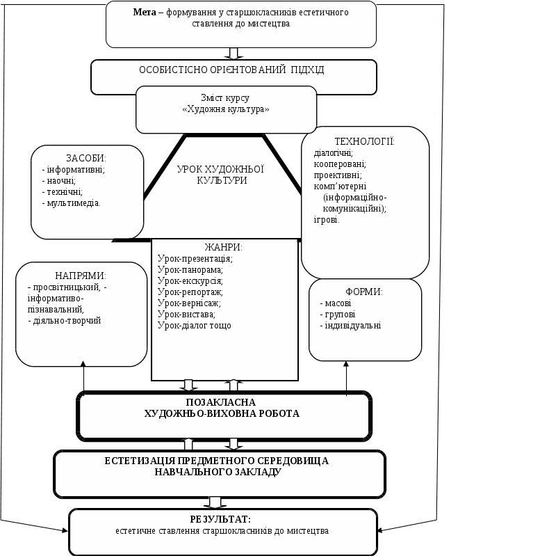 Мета педагогічної системи – формування у старшокласників естетичного ставлення до мистецтва зумовила виокремлення її основних складників: урок художньої культури, позакласна художньо-виховна робота, естетизація предметного середовища навчального закладу.