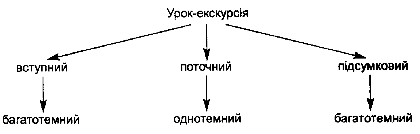 Показані на схемі уроки-екскурсії мають свою макроструктуру, яка відображає логіку процесу навчання, що здійснюється в межах кожного виду.