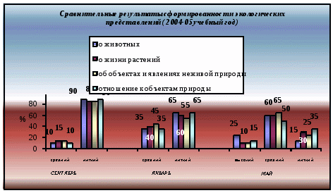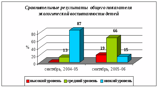 Анализ сравнительных результатов общего показателя экологической воспитанности детей выделенной группы выявил положительную динамику в его формировании за период с СЕНТЯБРЯ 2004-05 уч.года по СЕНТЯБРЬ 2005-06 уч.года. Так, экологическая воспитанность выросла до высокого уровня, который составляет 19%, значительные качественные изменения претерпел показатель среднего уровня, он вырос с 13% до 66% соответственно, а показатель низкого уровня экологической воспитанности снизился до отметки 15% (для сравнения: в СЕНТЯБРЕ 2004-05 уч.года составлял 87%).