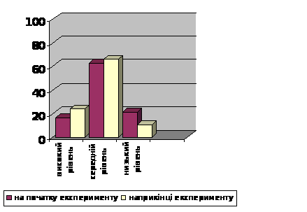 Виявилося, що наприкінці експерименту із 67 учнів високий рівень розвитку умінь і навичок первинного сприймання і, відповідно, вищу якість знань продемонстрували 24% учнів, середній – 65,5% і низький – 10,5% школярів. Порівняно з першим етапом формуючого експерименту, показники сформованості даних умінь зросли.