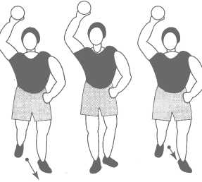 Приставні кроки дуже нагадують рухи ногами у фехтувальників. Завершується "Тіп-топ" випуском снаряда. Наголосити, що уявний кут випуску має бути близьким до 45° від поверхні землі. Відстань між учнями в парі від 10 до 15 м. Коли всі учні виконують "Тіп-топ" правильно (ніхто не робить нормальних кроків, а тільки приставні, та ще й за низької посадки), рухаємося далі і ускладнюємо вправи, зв'язуючи окремі ділянки. З'єднуємо три "Вітрячки" з трьома "Тіп-топами" одночасно, потім "проводжаємо" м'яч декількома кроками із "Сонечком". Якщо все виконується технічно правильно, рисунок руху стає досконалим, а значить — раціональним. Якщо учень успішно виконує зв'язку з декількох нешвидких кроків розбігу з приставними кроками, махів ліктем та "проводжанням" м'яча — оцінка 8 — 9 балів йому забезпечена. Ще раз наголосимо на важливості такого елемента кидка, як замах (мал. 3). Під час навчання треба намагатися досягти повного автоматизму у його виконанні. З іншого боку дітей на уроці можна залучати до творчого пошуку альтернативних способів виконання замаху, використовуючи, наприклад, рухи шаблею, коли козаки захищалися від багатьох супротивників, прийоми бейсбольного кидка тощо. Крім того, в кожного вчителя, мабуть, є свої секрети щодо навчання окремих рухів. Наприклад, щоб навчити учня правильного руху під час замаху із положення, коли пряма рука відведена назад і треба провести зігнутий лікоть вперед за плечем, коли передпліччя ще позаду, радимо йому ударити ліктем по долоні протилежної руки, яка знаходиться на рівні протилежного плеча і трохи попереду.