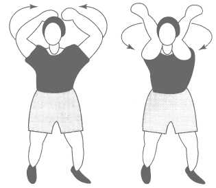 Далі завдання ускладнюються: нахилити тулуб вперед і зробити той самий рух двома руками. Потім, поволі піднімаючи тулуб, повторювати рух ("двері відчиняються — зачиняються") (мал. 1). Повторюючи рух, слабшу руку поступово опустити, щоб прийти до імітації метання сильнішою рукою вперед з одночасним рухом слабшої руки низом назад. Пояснити залежність успішності кидка від різкості руху: чим швидший рух руки назад, тим сильніше метаєш вперед [12].