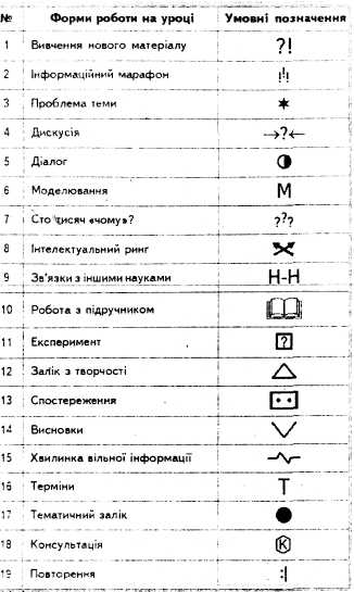 Велика насиченість моделі знаковою символікою ускладнює її використання, тому ми запропонували мінімум символічних засобів, які ототожнюють певні технологічні функції управління системою пізнавальної діяльності учнів на уроці. Ця символіка має свій зміст і несе певну інформацію [1].