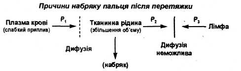Учні: Ні, не зможе. Тому що припинився відтік лімфи по лімфатичних судинах, крові по венах. Дифузія в цьому разі неможлива. Значить, збільшення об'єму тканинної рідини є основною причиною набряку.