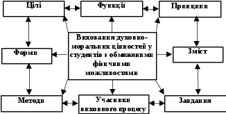 Рис. 1. Структурно-функціональна модель виховання духовно-моральних цінностей у студентів з обмеженими фізичними можливостями.
