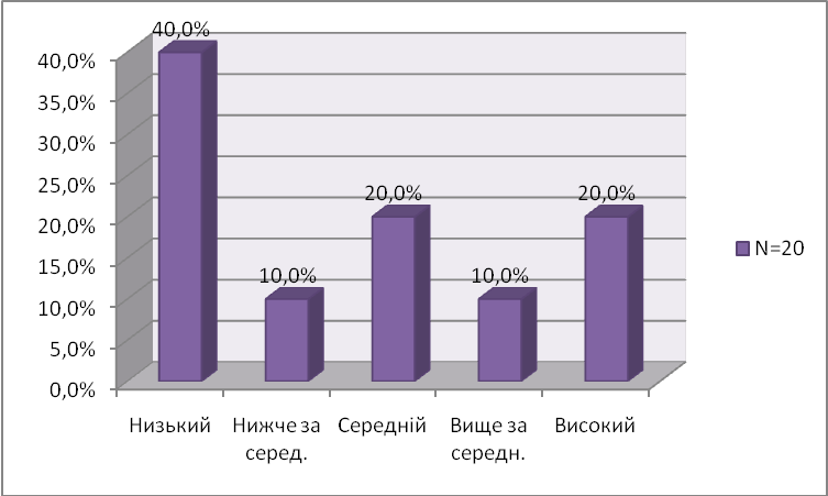 З рисунку 3.2.1 видно, що у більшості (40%) хлопців другого класу виявлений низький рівень об'єму уваги. Високий та середній рівень розвитку об'єму уваги визначений у 20%. В одинакової кількості хлопців другого класу спостерігається нижчій за середній та вищий за середній рівнь розвитку об'єму уваги (по 10% відповідно).