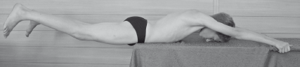 Большая ягодичная мышца. И. п. – лежа на животе, руки вверх, удерживаясь за кушетку, передние верхние подвздошные ости на краю кушетки. Ребенок разгибает бедра, немного отведя их в стороны, и удерживает в таком положении 15–30 с. Преподаватель оценивает симметричность расположения ног и время выполнения упражнения (рис. 4).