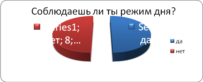 В первом классе на уроках "Окружающий мир" мы изучили тему "Режим дня школьника". Каждый ученик составил свой распорядок деятельности и отдыха в течение суток. Я тоже расписал свой режим на весь день. Мы провели опрос в классе, в котором участвовало 16 человек. Он включал два вопроса: соблюдаешь ли ты режим дня? Если да, то в чем он тебе помогает? Результаты выглядят следующим образом: