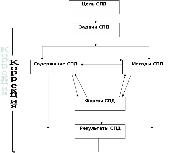 Цель СПД и ее конечные результаты зависят от того, насколько правильно определено содержание, какие выбраны методы для ее достижения и формы ее организации этой деятельности. Понятно, что содержание, методы и формы могут существовать независимо друг от друга, их взаимосвязь определяется тем, что содержание влияет на формы и методы, те в свою очередь могут корректировать содержание и формы; кроме того, формы и методы также взаимосвязаны (схема1).