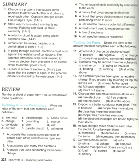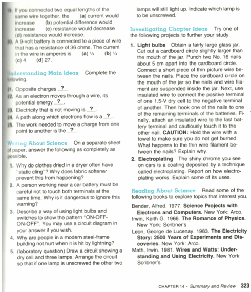 Введение в электричество осуществляется примерно одинаково – вводятся определения, устанавливаются правила и т.п. Однако далее начинаются различия: в отечественном пособии каждое фундаментальное понятие (проводник, электризация, заряд, поле и т.д.) выделено в отдельный параграф, после которого следуют, как уже раньше замечали, контрольные вопросы, выводы и упражнения, что, на мой взгляд, способствует запоминанию и усвоению материала, а не только ознакомления с ним. В американском же учебнике по ходу изучения задаются некоторые вопросы, на которые предлагается сразу ответить. А основной блок (который занимает всего лишь полный лист) с выводами, тестовыми заданиями (которых в отечественных учебниках нет), и вопросами не содержит ни одной задачи на вычисление, но качественные задачи присутствуют в достаточном количестве (5-7 задач). (Приложение 1)