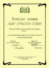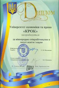 Нагороджується ВНЗ «Університет економіки та права «КРОК» За міжнародне співробітництво в галузі освіти і науки |
