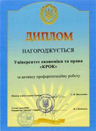 Дипломом нагороджується Університет економіки та права «КРОК» за активну профорієнтаційну роботу |