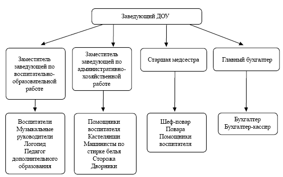 Дошкольное учреждение имеет управляемую и управляющую системы. Управляемая система состоит из взаимосвязанных между собой коллективов: педагогического, медицинского и обслуживающего. Организационная структура управления в дошкольном учреждении представляет собой совокупность всех его органов с присущими им функциями. Она может быть представлена в виде трех уровней.