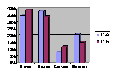 На базі Красноармійського навчально-виховного комплексу серед учнів 11-а, б класів було проведено дослідження з метою вивчення особливостей сприйняття, виявлення ведучого каналу репрезентативної системи. В опитуванні взяло участь 62 учні.