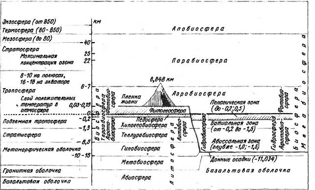 Рис. 2. Соотношение слоев биосферы с высотами их распространения