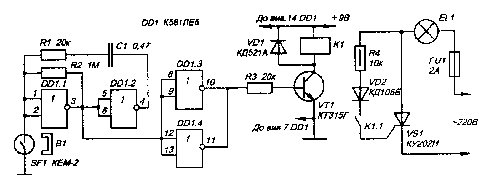 Коли віддалити магніт B1 від геркона, то мультивібратор на логічних елементах DD1.1, DD1.2 починає генерувати імпульси з частотою 1 Гц. Вільний елемент DD1.4 ввімкнуто паралельно до DD1.4 для поліпшення навантажувальних характеристик. Транзистор VT1, що працює в ключовому режимі, керує реле K1, яке своїми контактами K1.1 з частотою 1 Гц то відкриває, то закриває тринiстор VS1, який комутує живлення лампи (її потужність може сягати 200 Вт).