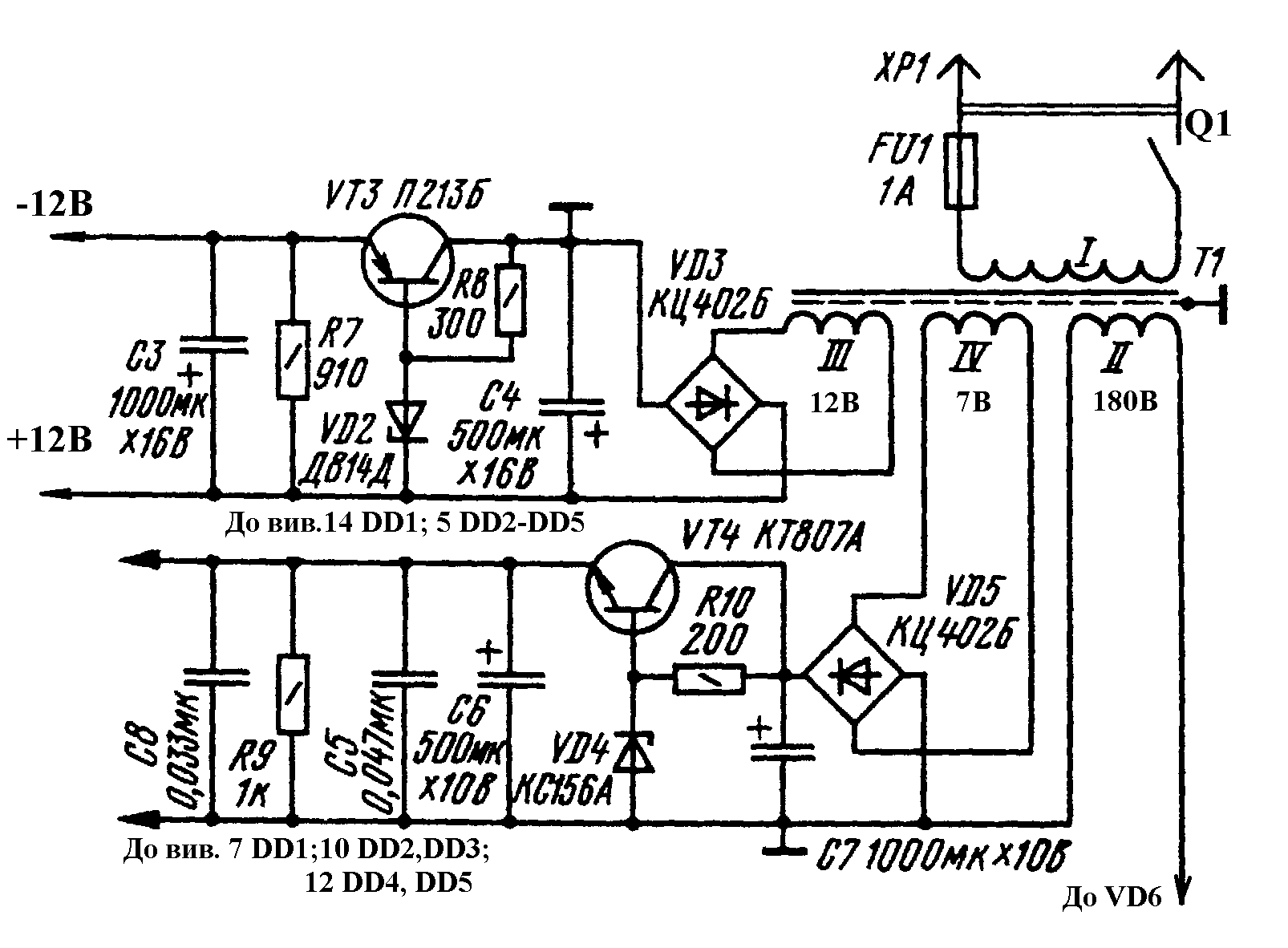 Блок живлення (див.принципову схему рис. 29) складається з трьох випрямлячів із стабілізованою вихідною напругою, випрямляч на діодному мості VD3 живить фотореле, обмотки електромагнітів, світловий пістолет. Випрямляч на діодному мості VD5 призначений для живлення лічильника. Змінна напруга величиною 180В з обмотки трансформатора Т1 подається на однопівперіодний випрямляч (діод VD6), а з нього на аноди газорозрядних індикаторів. Для повторення вказаної конструкції, необхідні наступні радіодеталі: постійні резистори МЛТ вказаної на схемі потужності, підстроювальні (RЗ у вузлах АІ-А6) - СПЗ-1а; фоторезистори ФР-1, конденсатори СЗ,С8 - МБМ або інші малогабаритні; електролітичні конденсатори типу К5О-б, К50-12 з зазначеною на схемі робочою напругою; транзистори фотореле - серії МП40-МП42 з коефіцієнтом передачі струму не менше 50. Транзистори VТЗ - будь-які з серії П213-П217, VТ4 -будь-який з серії КТ807 (його необхідно встановити на радіатор виготовлений з листового алюмінію товщиною 2 мм при габаритних розмірах 30 х 20мм). Діоди VD1 блоків фотореле - будь-які із серії Д9, Д220; діодні блоки VDЗ, VD5 - будь-які із серії КЦ402, КЦ405; діод VD6 - будь-який розрахований на зворотню напругу не менше ЗООВ. Динамічні головки потужністю 1-2 Вт (опір звукової котушки - б-1О ом). Трансформатор блоку живлення намотано на магнітопроводі Ш16х20. Первинна обмотка трансформатора містить 2355 витків проводу ПЭВ-1 (діаметр проводу - 0,12 мм.), обмотка ІІ - 2050 витків проводу ПЭВ-1- 0,1 мм; обмотка ІІІ - 129 витків ПЭВ-1 - 0,31 мм; обмотка ІV 75 витків ПЭВ-1 - 0,2б мм.