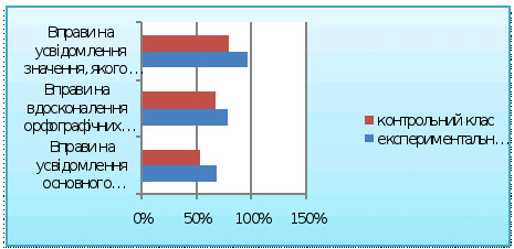 Результати експериментального дослідження свідчать про те, що ефективність застосування даної методики очевидна, оскільки вся система вправ забезпечує істотно вищий рівень результативності і спрямована на розвиток розумових здібностей школярів, формування орфографічних та орфоепічних навичок, розвиток творчої активності учнів.