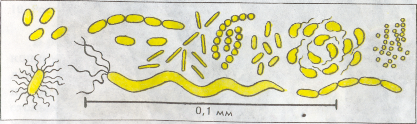 Затем учитель знакомит учащихся с бактериями. Он подчеркивает, что это одноклеточные организмы, у них нет оформленного ядра, отмечает их отличия от растений, демонстрируя таблицы «Бактерии», «Строение растительной клетки». В процессе беседы, демонстрации бактерий под микроскопом школьники узнают о строении н жизнедеятельности бактерий, их многообразии по форме, размерам, передвижению. В то же время учащиеся находят общие черты в строении и процессах жизнедеятельности бактерий.