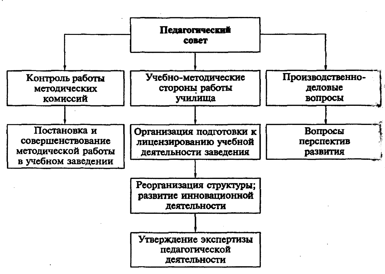 Педагогический совет по Уставу учебного заведения вправе решать все вопросы жизни училища, но - применительно к методической деятельности - это, прежде всего, вопросы, связанные с постановкой учебно-воспитательного процесса (рисунок 1) [9]. Подчеркнем: мерилом и конечной целью всей деятельности педсовета является повышение роста педагогического мастерства: и улучшение эффективности педагогической деятельности.