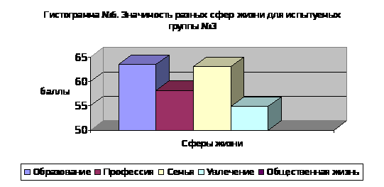 Наименее значимыми ценностями является креативность и активные социальные контакты. Это свидетельствует о том, что испытуемые в меньшей мере стремятся к реализации свои творческих способностей, внесению различных изменений во все сферы своей жизни. Они не считают необходимым "ломать" стереотипы, тем самым, внося разнообразие в свою жизнь. Их устраивает размеренный ход жизни, и они не всегда стараются внести в нее что-то новое. В данный момент своей жизни старшеклассники не рассматривают в качестве важнейшей ценности благоприятные взаимоотношения с другими людьми. Для них, как правило, не очень значимы многие аспекты человеческих взаимоотношений, поэтому возможность общения с другими людьми они не считают самым ценным в своей жизни. Наиболее значимой сферой для всех испытуемых является сфера образования, что вполне логично, если учесть их возраст. Для старшеклассников характерно стремление к повышению уровня своей образованности, расширению кругозора. Самое главное для них сейчас это учиться и получать новые знания. Наименее значимой для себя считают сферу семейной жизни. Можно предположить, что создание собственной семьи – довольно далекая перспектива, а возможность реализации собственных ценностей в родительской семье несколько ограничены. Гистограммы и таблицы, иллюстрирующие особенности сферы терминальнх ценностей у испытуемых трех групп, представлены в Приложении №2.