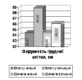 Згідно отриманих даних довжина тіла у міських школярів в середньому на 2,1 см більші, ніж у сільських. Достовірно більші показники динамометрії і окружності грудної клітки у сільських школярів. Індивідуальний аналіз також показав, що серед міщан частіше зустрічаються високорослі.