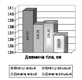 Як показали наші дані і дослідження міські школярі більш високорослі. У них відносно більші поздовжні, а у сільських широтні розміри. Довжина тіла у міських більша в середньому на 2,3 см, серед них частіше зустрічаються високорослі.