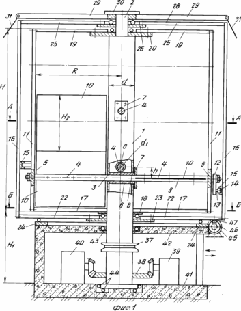 Внутреннее помещение конуса 4 может быть весьма значительным (например при строительстве ветроэлектростанций мощностью в 5-6 тысяч киловатт) и может быть использовано не только для размещения генераторов и приборов управления станцией, но и какого-либо технологического оборудования для производства той или иной продукции (при обеспечении звуком и теплоизоляции) и может быть выполнено в два и три этажа.