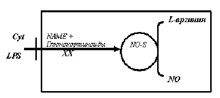 Активация рецепторов гепатоцитов, клеток моноцитарно-макрофагальной системы и некоторых клеток крови цитокинами (Cyt) и липосахаридами (LPS), под влиянием которых происходит индукция индуцибельной синтазы окиси азота, синтезирующей NO из L-аргинина. Блокада (ХХ) i-NOS глюкокортикоидами или другими блокаторами ее активности. Образовавшийся NO диффундирует в межклеточное пространство [8],[9].