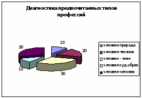 Благодаря переходу к рыночным отношениям расширился круг выбора профессии. Однако из-за недостаточной осведомленности у школьников складывается неправильное представление о многих из них. Случается так, что какой-то вид занятий может увлечь при более детальном ознакомлении с ним. Поэтому одна из основных задач — обратить внимание старшеклассников на те профессии, по которым бывают вакансии, как можно подробнее рассказать о них. Консультант помогает выбрать одно из направлений профессиональной деятельности ("человек—природа", "человек—техника", "человек—художественный образ", "человек—человек"), наиболее соответствующее его желаниям и склонностям. Именно направление, а не профессию. Затем идет совместное обсуждение перечня входящих в направление профессий [12, c.23].