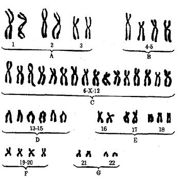 Рис. 2 Схематическое изображение кариотипа мужчины, страдающего синдромом Дауна. Нерасхождение хромосом G21 в одной из гамет привело к трисомии по этой хромосоме
