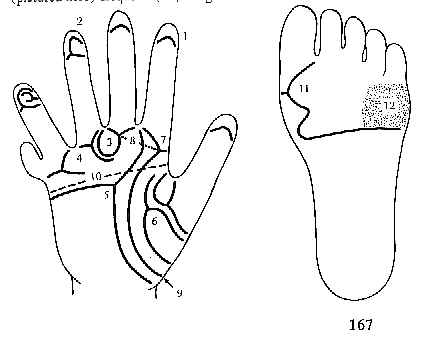 9. окончание главной ладонной линии "D" в поле 11 или на радиальном крае ладони;