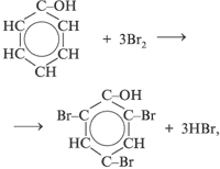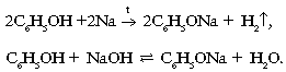 В отличие от радикалов алканов (СН>3>–, С>2>Н>5> – и т. д.) бензольное кольцо обладает свойством притягивать к себе электронную плотность кислородного атома гидроксильной группы. Вследствие этого атом кислорода сильнее, чем в молекулах спиртов, притягивает к себе электронную плотность от атома водорода. Поэтому в молекуле фенола химическая связь между атомом кислорода и атомом водорода становится более полярной, а водородный атом более подвижен и реакционноспособен.