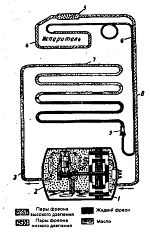 Компрессор смазывается фреонным маслом, температура застывания которого не выше -40°С. Хладагент фреон- 12 и масло не меняются в течении всего времени эксплуатации электрохолодильника.