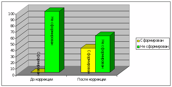 Итак, у дошкольников экспериментальной группы после коррекционной работы улучшилось состояние фонематического слуха: 80% детей правильно повторяли слоги, отличающиеся по глухости-звонкости, твердости-мягкости, по способу образования (ца-са), по месту образования (са-ша), т.е. у этих дошкольников фонематический слух сформирован. У остальных дошкольников экспериментальной группы (20%) фонематический слух сформирован частично, так как дошкольники затруднялись при повторении слогов со звуками, отличающимися по месту образования (ра-ла).