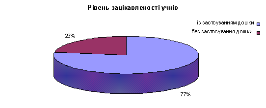 Такий урок виявився дуже ефективним, адже в учнів з’явилося бажання створити свої презентації для інших тем і молодших класів, для цього їм треба було знайти і опрацювати інформацію. Крім того, з’явився інтерес до уроків. Рівень зацікавленості та підготовки до застосування мультимедійної дошки і після можна подати у вигляді діаграми: