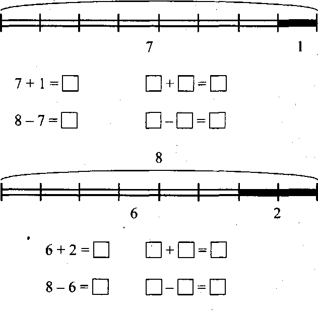 Д. В первый пустой квадрат я впишу число 8, потому что 7 + 1 = 8. Потом поменяю слагаемые местами и получу 1 + 7 = 8. В третью строчку вписываю число 1, потому что 8 - 7 = 1. В четвертой строчке записываю: 8-1=7.