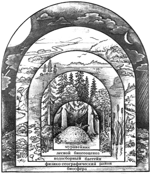 Чем меньше размер экосистемы, тем теснее взаимодействуют входящие в ее состав организмы. Экосистема муравейника входит в состав лесного биогеоценоза, а он, в свою очередь, – часть географического ландшафта.