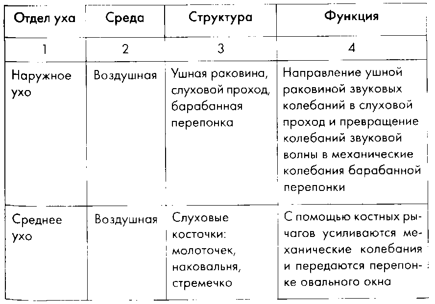 Рассказ о строении и функции каждого отдела уха с заполнением таблицы.